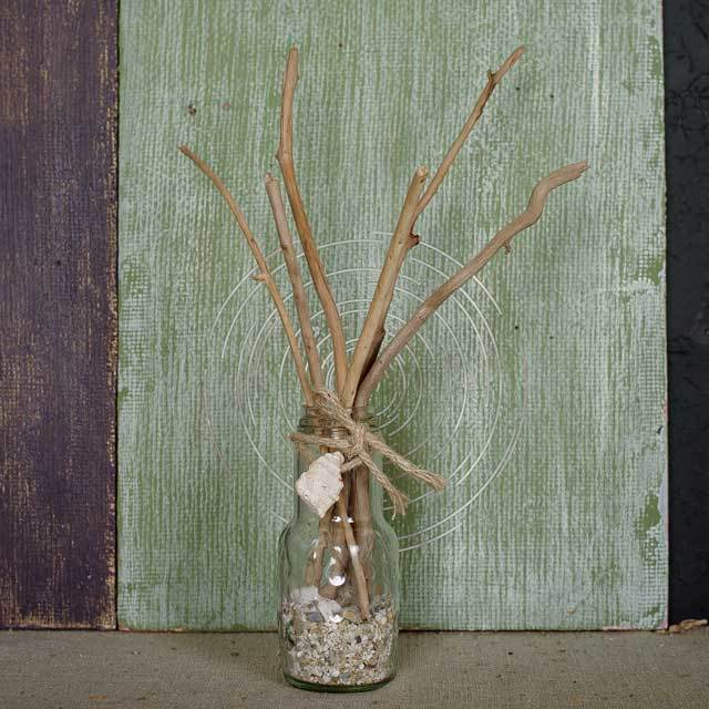 海辺にたどり着いた漂着ビンに小枝の流木を6本立ててます。