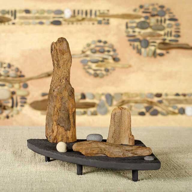 群青色のマットの上に3個の流木と3個の小石で小宇宙を作りました。