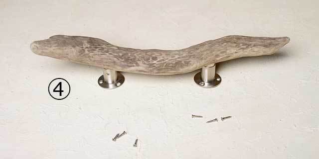 ⑤ 流木から丸棒付き金具を外し、印を付けたところに3本のネジで金具を取り付けます。